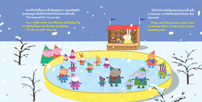 เป๊ปป้าและครอบครัวของเธอกำลังจะไปเล่นสเกตน้ำแข็งด้วยกัน! แต่ติดปัญหาเดียวคือ... เป๊ปป้ายังเล่นสเกตน้ำแข็งไม่เป็นเลย! เป๊ปป้าจะหาจังหวะของตัวเอง แล้วสนุกไปกับทุกคนได้หรือไม่? มาติดตามเรื่องราวที่แสนสนุกกันเลย ในนิทานสองภาษา (ไทย-อังกฤษ) พร้อมภาพประกอบสุดน่ารัก หนังสือเล่มนี้ช่วยส่งเสริม IQ ความฉลาดทางสติปัญญา ส่งเสริม EQ ความฉลาดทางอารมณ์ และส่งเสริม CQ ความฉลาด ในการริเริ่มสร้างสรรค์