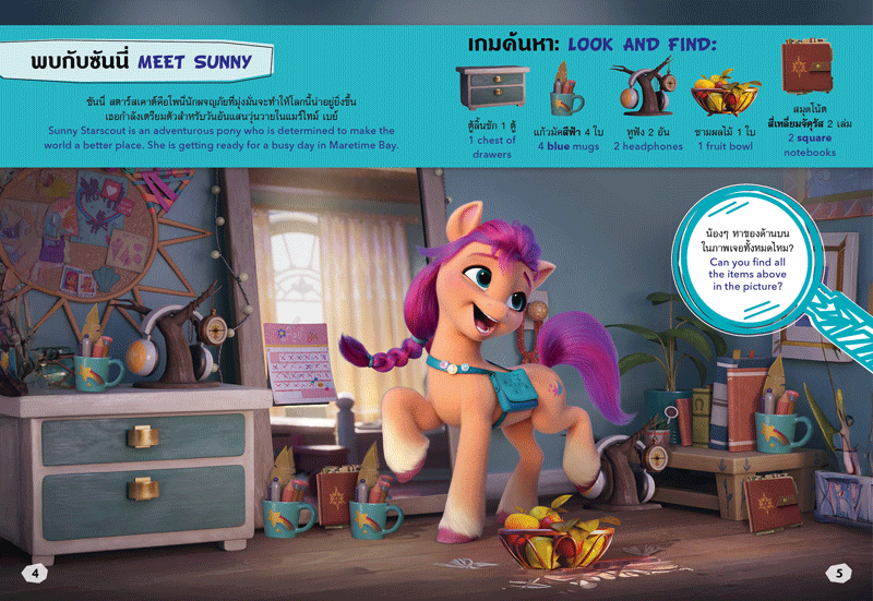 แฟนๆ มายลิตเติ้ลโพนี่มาค้นหาสิ่งของทั้งหมดในภาพแต่ละภาพของซันนี่ สตาร์สเคาต์และเพื่อนๆ ได้ไหม? ค้นหาของแต่ละชิ้นในฉากต่างๆ พร้อมเรียนรู้ตัวเลข สี และรูปทรง ในหนังสือเสริมทักษะ 2 ภาษา (ไทย-อังกฤษ) ถ้าพร้อมแล้วก็มาสนุกกันเลย หนังสือเล่มนี้ช่วยส่งเสริม IQ ความฉลาดทางสติปัญญา ส่งเสริม EQ ความฉลาดทางอารมณ์ และส่งเสริม CQ ความฉลาด ในการริเริ่มสร้างสรรค์