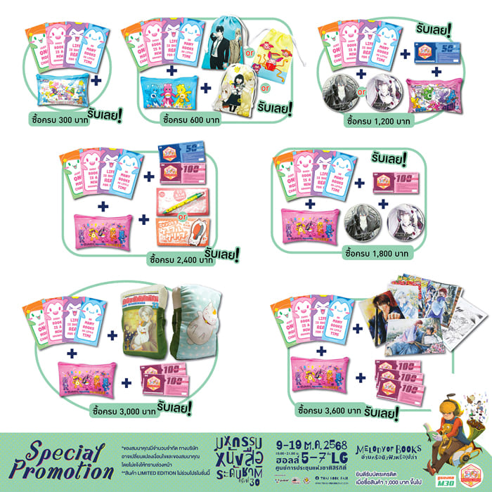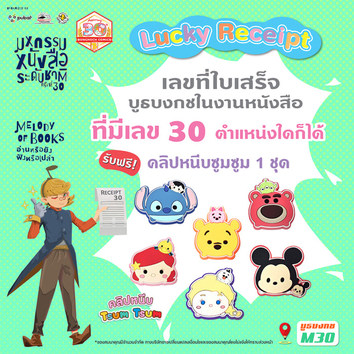 🎫 คูปองแทนเงินใช้ชำระค่าสินค้าแทนเงินได้ทันทีโดยไม่มีการกำหนดยอดซื้อขั้นต่ำ และใช้คูปองแทนเงินหลายใบร่วมกันได้ เมื่อซื้อสินค้าในใบเสร็จถัดไปที่บูธบงกชในงานมหกรรมหนังสือระดับชาติ ครั้งที่ 30